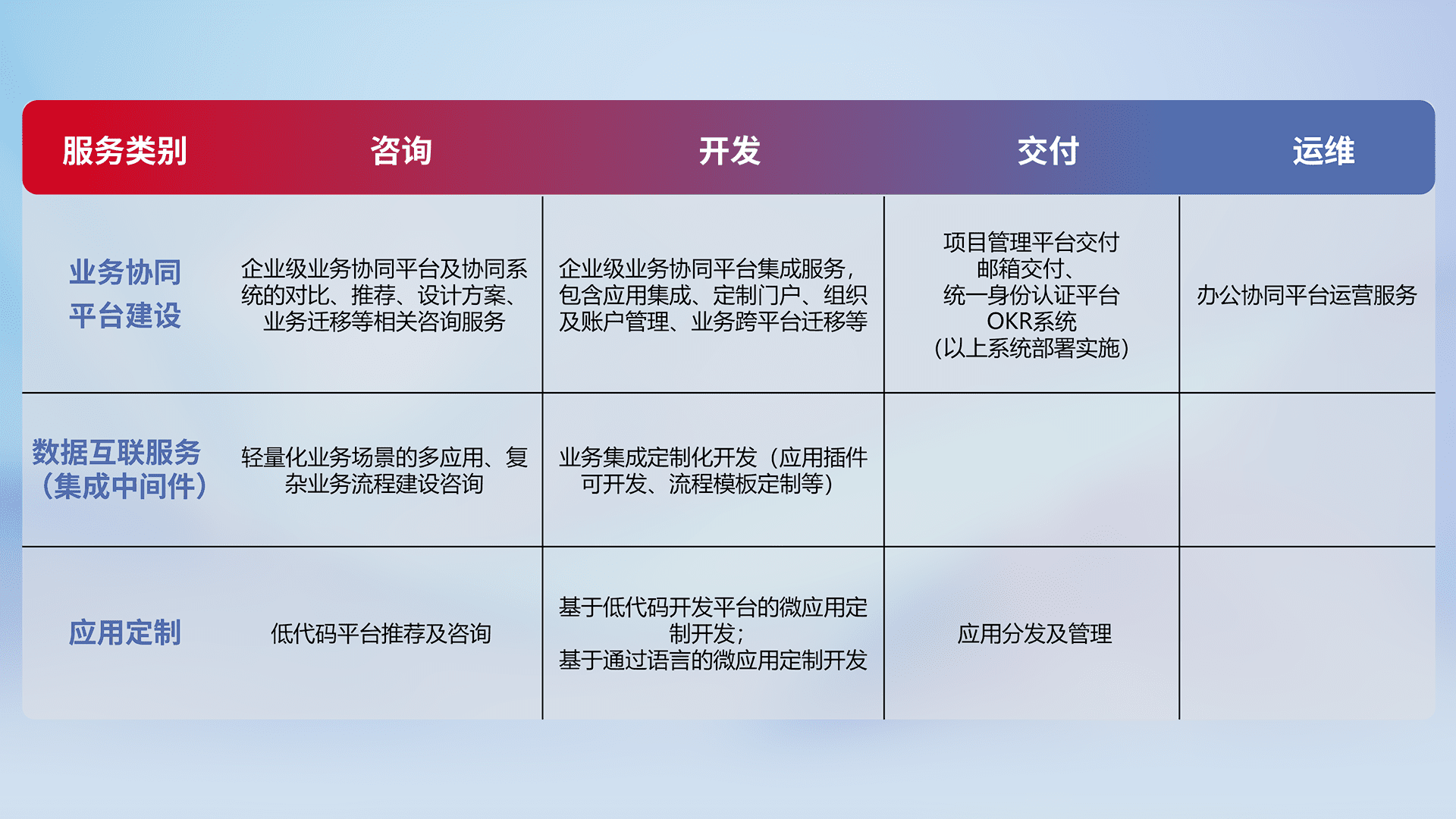 针对钉钉、、、企微、、IDaas等平台级产品提供产品的规划、、方案、、交付、、定制化开发等服务,,实现如统一协同办公、、、、智能客户服务、、混合会议管理、、、智能数据查询、、、等业务场景,,,实现数字化转型。。。