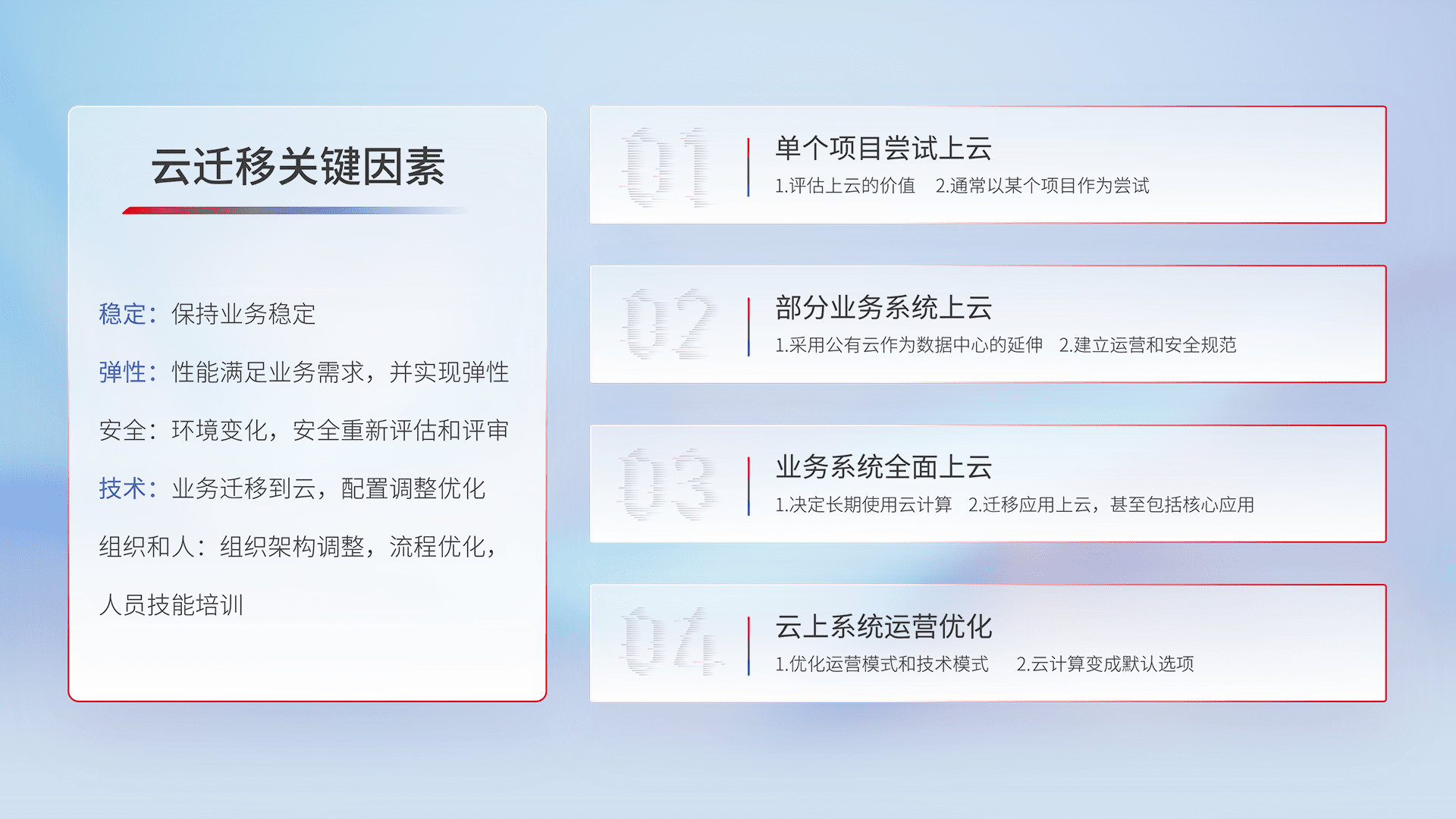 结合实际业务,,从规划设计、、云平台选型、、云原生改造、、数据迁移、、、集成交付,,,迁移全过程为客户识别最佳上云路径,,做好风险识别管理,,,,设计网络架构、、、身份权限、、安全审计合规、、、、操作审计、、、日志审计、、、、监控告警策略、、、多站点容灾设计等,,对云上基础设施进行整体规划,,,提升IT治理水平,,,,以满足弹性、、、高可用、、高性能的需求。。